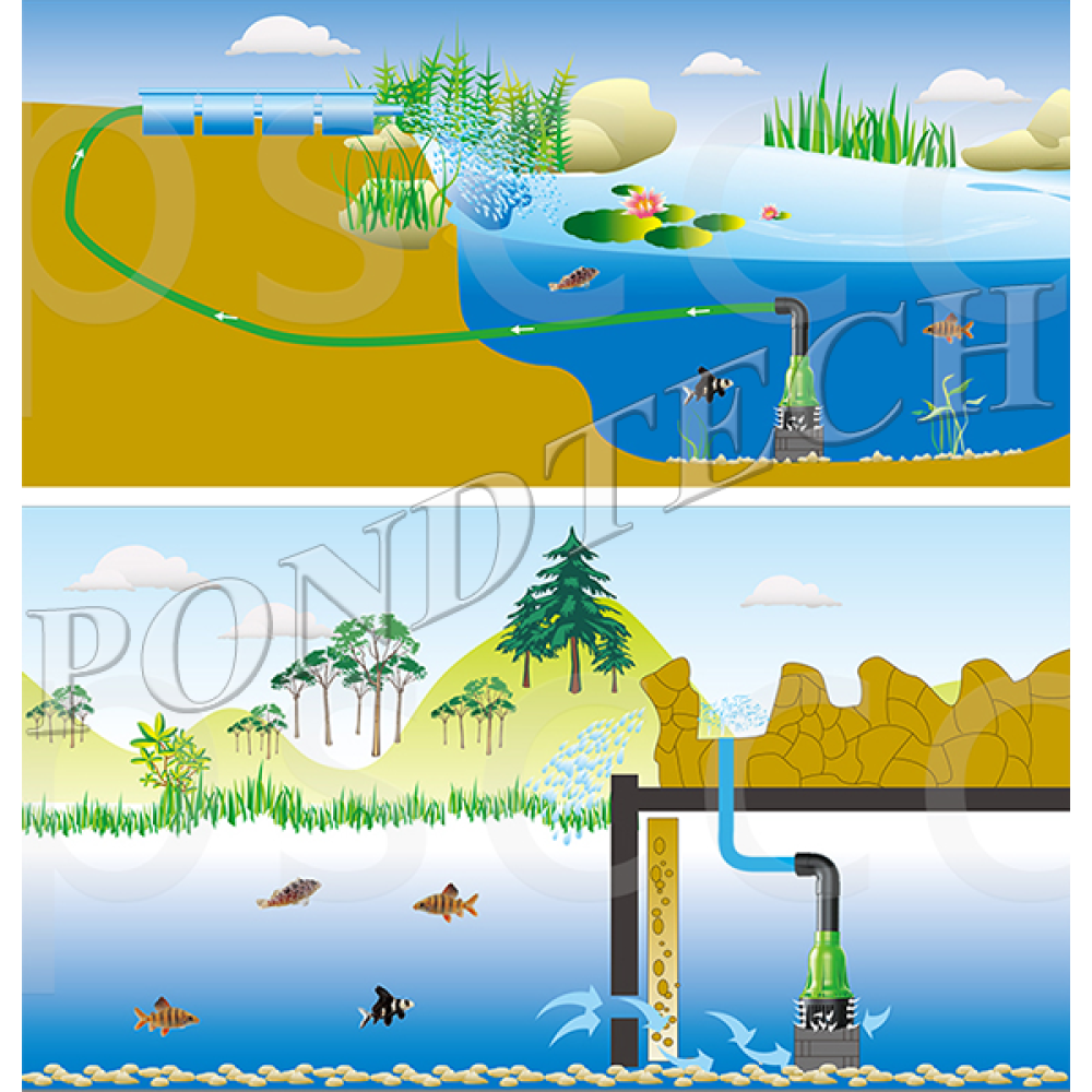 Погружной насос для пруда, также возможна сухая установка ниже уровня воды. Оснащен двойным фильтром предварительной очистки.