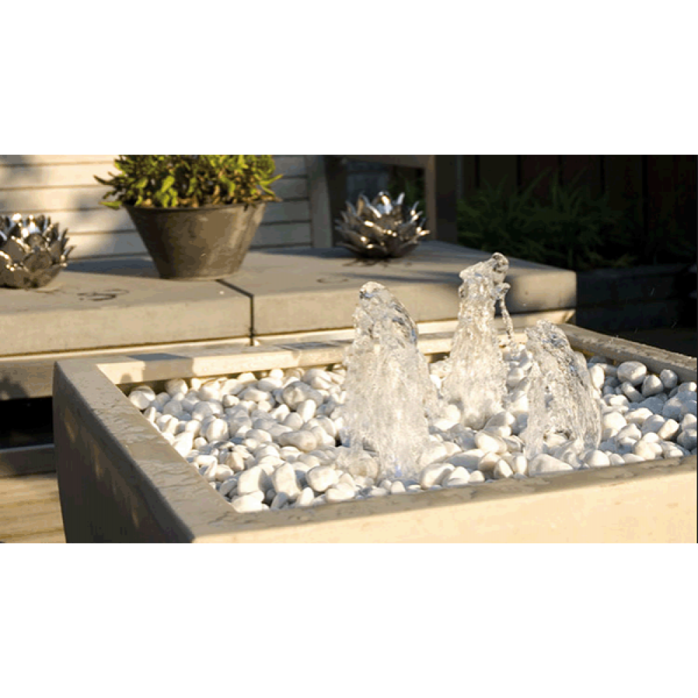 Готовая фонтанная установка с автоматической сменой водных картин за счет последовательного переключения встроенного гидравлического клапана. Бесступенчатое регулирование продолжительности действия каждой из водных картин, простые регулировки для установки высоты каждого фонтана. Имеется встроенная подводная подсветка с четырьмя светофильтрами разных цветов. Устанавливается в любую подходящую емкость и начинает работать сразу же после включения в электрическую сеть.