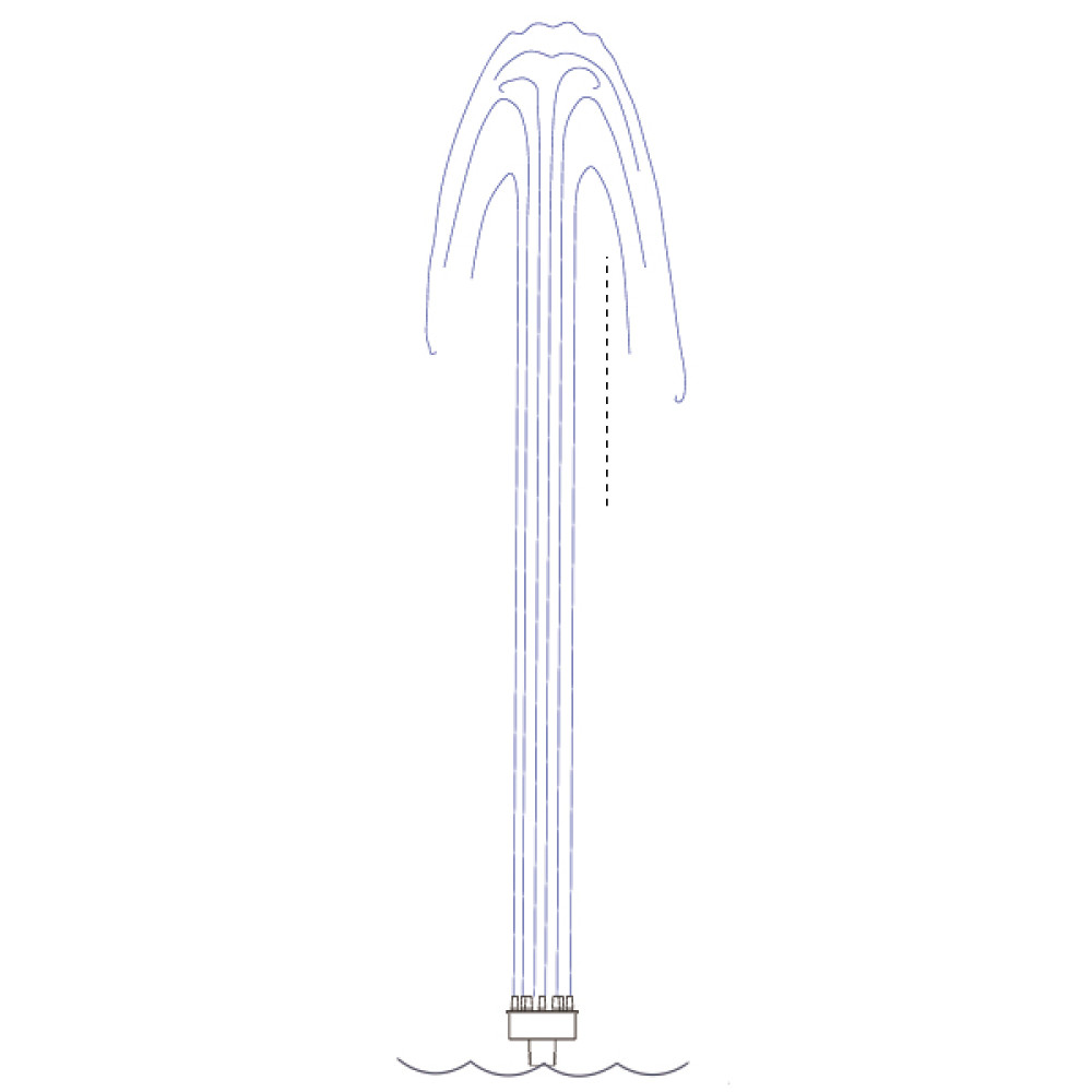 Воздух и вода смешиваются в нужных пропорциях внутри струй, создавая впечатляющий, шипучий, пенистый водяной столб. Отличительная форма воды шипучих струй очень богата и прочна при высоте распыления от 20 см до более чем 4 метров; очень заметный и ветроустойчивый водный эффект подходит для заполнения любых масштабных фонтанных композиций стройными, живыми белыми водяными столбами. Фонтанная насадка […]