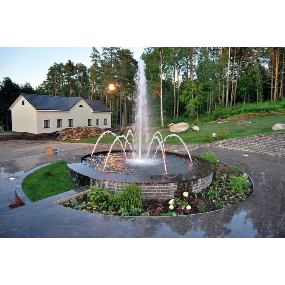 Моноструйная насадка, встроенное шаровое соединение обеспечивает возможность создания различных водных картин: от строго вертикальной до параболической. При комбинировании насадок типа Lance Jet достигаются красивые оригинальные эффекты.