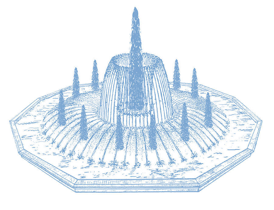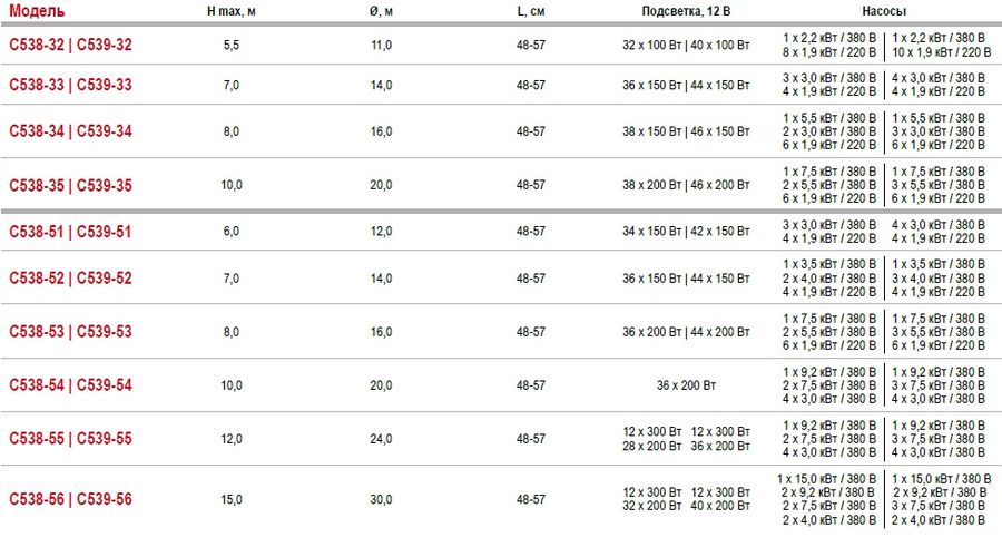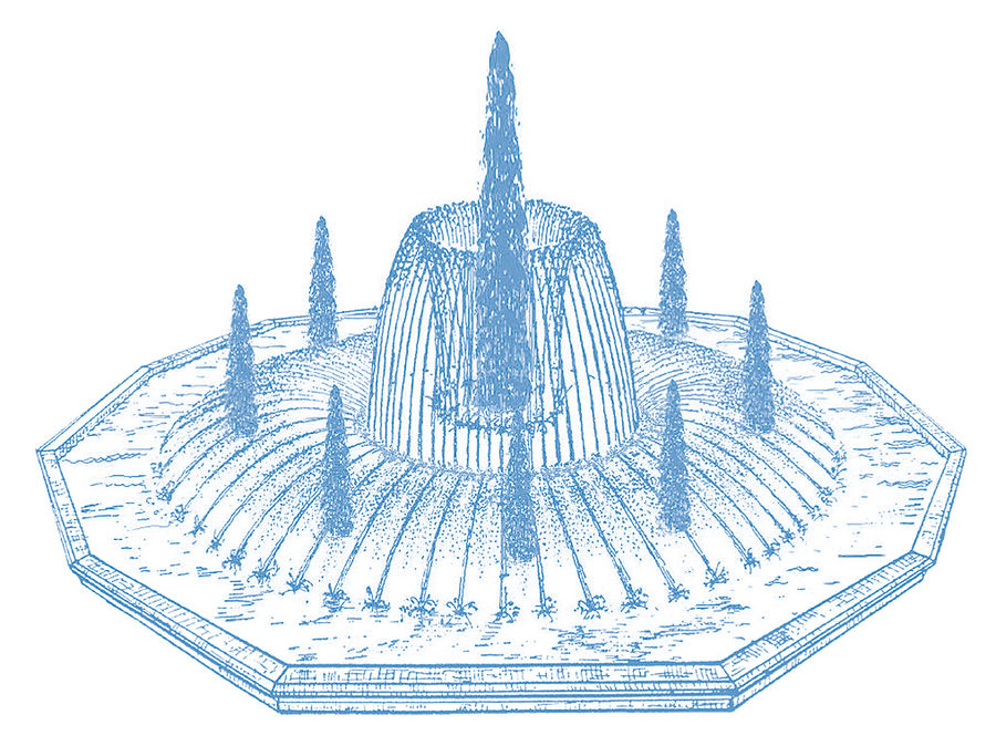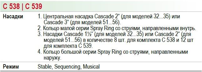 Фонтанные комплекты FONTANA представляют собой готовые к монтажу системы. Они включают в себя погружные насосы, насадки, светильники, трубопроводы, монтажные элементы. В фонтанных комплектах FONTANA используются погружные насосы, выполненные из нержавеющей стали. Насадки изготовлены из нержавеющей стали, латуни или бронзы, фонтанные кольца изготовлены из нержавеющей стали. Подводные галогеновые светильники выполнены из нержавеющей стали и снабжены разноцветными светофильтрами: красными, синими, зелеными, желтыми. При заказе фонтанный комплект необходимо дополнить системой контроля уровня воды, датчиком контроля ветра, трансформаторами подсветки, подводными клеммными коробками, шкафом управления, кабелем для насосов и светильников, закладными элементами. В составе комплекта имеются кабели следующей длины: • с каждым насосом (220В) – 10 м; • с группой светильников соединенных одним кабелем, свободный конец кабеля от крайнего светильника – 3 м.Всего выпускается 3 серии фонтанных комплектов: Серия B включает в себя фонтаны без распределительных колец.Серия С включает в себя фонтаны, имеющие от 1 до 6 распределительных колец. Главное отличие – внешнее кольцо распыляет воду наружу.Серия D включает в себя фонтаны, имеющие от 1 до 6распределительных колец. Главное отличие – внешнее кольцо распыляет воду внутрь. Фонтанные комплекты поставляются в трех вариантах комплектации: Stable – водная картина и подсветка фонтана в процессе работы не меняются. Sequencing – водная картина и подсветка фонтана динамичны. Посредством системы управления происходит последовательное изменение водных форм. Специальным блоком управления возможна регулировка скорости смены водных картин и их очередность. Для создания динамичного фонтана необходимо две и более независимых фонтанных системы сменяющих друг друга, либо работающих одновременно. Sequencing также может работать в режиме Stable. Musical – водная картина и подсветка изменяются в такт поступающему музыкальному сигналу, фонтан «танцует» согласно музыкальному ритму. Музыкальные фонтаны функционируют со специальным электронным блоком, который подключается к любому источнику звука (CD проигрыватель, микрофон и т.д.) и синхронизирует его с работой фонтана. Для создания музыкального фонтана необходимо три и более независимых водных картин. Музыкальный фонтан необходимо дополнить акустической системой. Musical способен работать в режиме Sequencing и Stable. Меры безопасности! Фонтаны и осветительные установки должны быть установлены согласно действующим правилам ПУЭ и ПТБ. Подключения должны быть выполнены квалифицированным электриком.