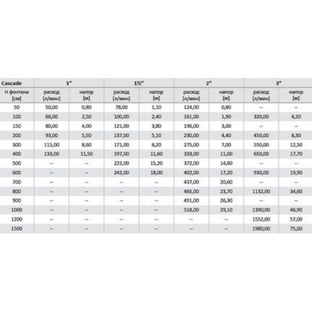 Высота фонтана на агрегате 1,1 кВт/230 В9 мВысота фонтана на агрегате 2,2 кВт/400 В11,5 мВысота фонтана на агрегате 4,0 кВт/400В16,5 мДиаметр фонтана на агрегате 1,1 кВт/230 3 мДиаметр фонтана на агрегате 2,2 кВт/4003,2 мДиаметр фонтана на агрегате 4,0 кВт/4003,5 мАртикул50375