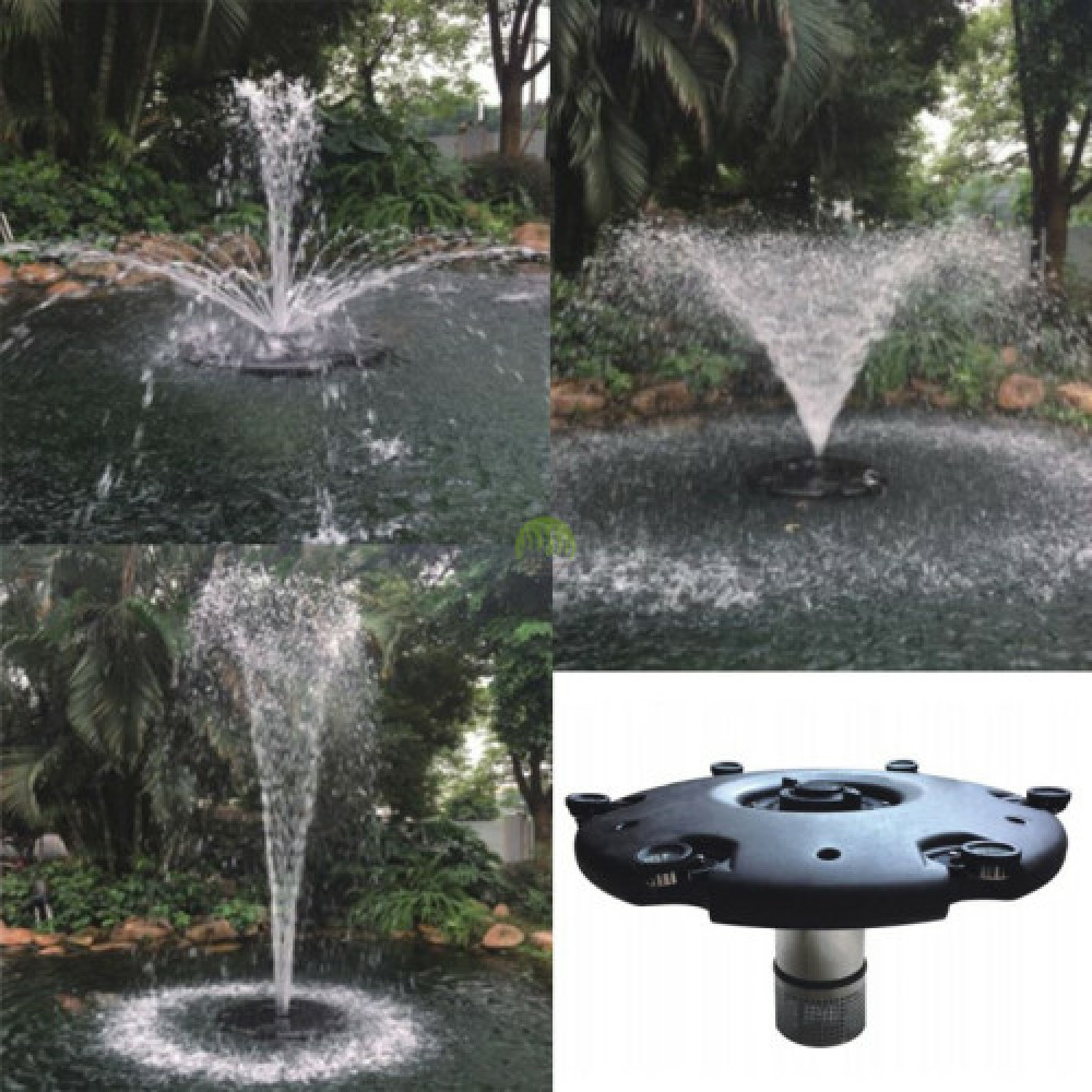 Плавающий фонтан Jebao FD 36. Поставляется готовым устройством. Находят применение в случае отсутствия возможность установить фонтанный насос на дно пруда. Требуемый минимальный уровень воды – 50 см. Имеют высокую степень электрозащиты. Компактны и просты в обслуживании. В комплекте: — Поплавок — Насос — Насадки 2 шт